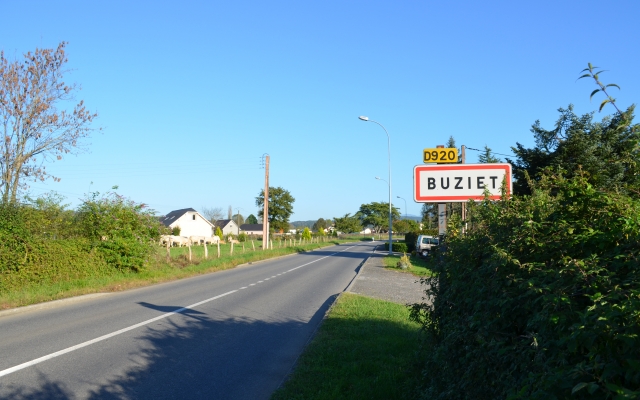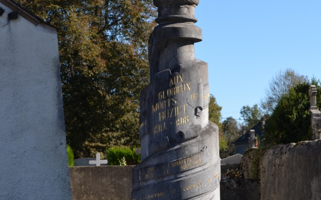 Inauguré après la 1ere Guerre Mondiale, il se situait à l’origine au centre de la place de la Mairie. Il fut déplacé à côté de l’Eglise suite à des travaux d’aménagement du devant de la Mairie mais aussi pour des raisons de commodités. Il se présente sous la forme d’une colonne autour de laquelle s’enroule comme un parchemin sur lequel est inscrit les noms des victimes. Le cartouche central porte l’inscription Aux glorieux morts de Buziet . La base du monument est ceinte d’une palme, symbole de martyre, au sommet un buste qui représente un poilu casqué.